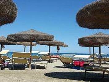 Village résidentiel en bord de mer avec piscine commune, supérette, restaurants et pizzeria.